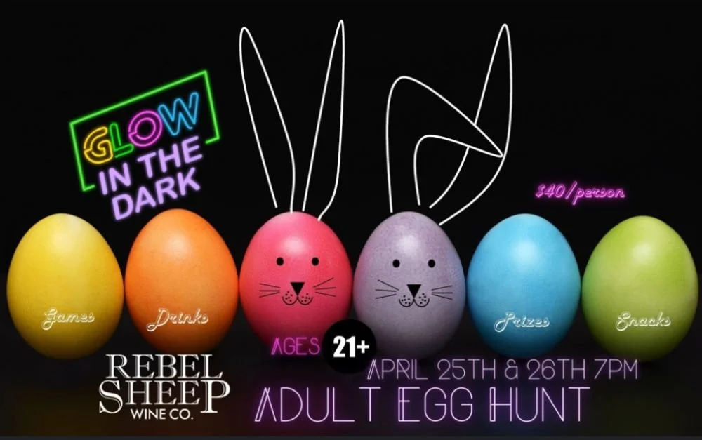 Don’t miss this fun event at Rebel Sheep Wine Co. for adults 21+ only! Enjoy “hoppy hour” and a glow in the dark Easter egg hunt with candy and a chance to win prizes!